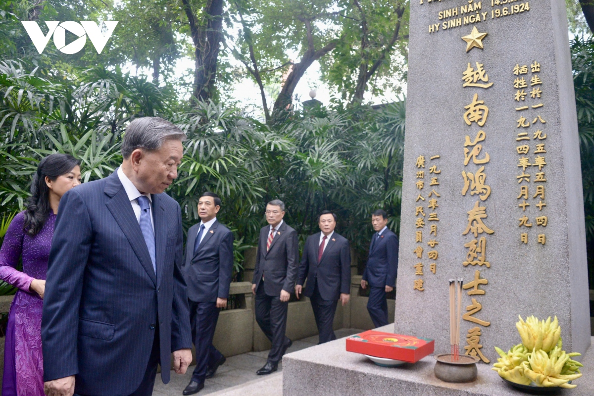 광저우시의 문화 관광지인 황화강72열사능원에서 또 럼 서기장‧주석과 영부인, 베트남 고위급 대표단은 팜 홍 타이 열사를 추념 분향‧헌화를 하고 혁명 기성 시대의 공로를 추념했다.