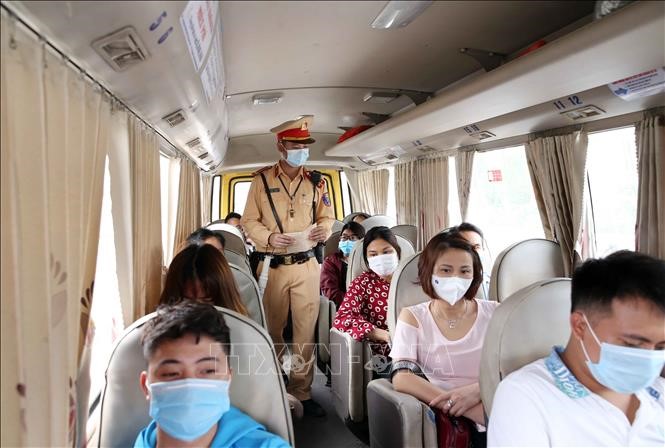 5월 2일 하노이시 교통경찰이 버스 승객들이 마스크 착용하는 것을 점검하고 있다. [사진: 팜끼엔/ 베트남통신사]
