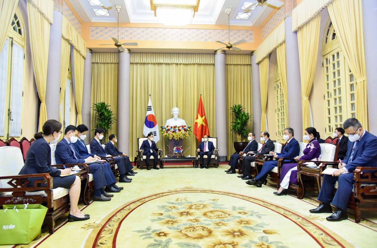 접견식에서 응우옌 쑤언 푹 주석은 양측이 무역투자, 과학기술, 문화-교육 등 다분야에서 협력여지를 효과적으로 개발할 필요가 있다고 밝혔다. 또한, 한국 정부가 한국 거주 베트남 국민 공동체에 대한 지원과 더불어, 한국에 베트남어와 문화를 더욱 광범위하게 소개할 수 있도록 지원해 주기를 희망하였다. 응우옌 쑤언 푹 주석은 한국이 코로나19 백신 제조 및 코로나19 치료 연구에 대한 경험 및 의료 자원을 나눌 수 있기를 희망한다고 밝혔다.