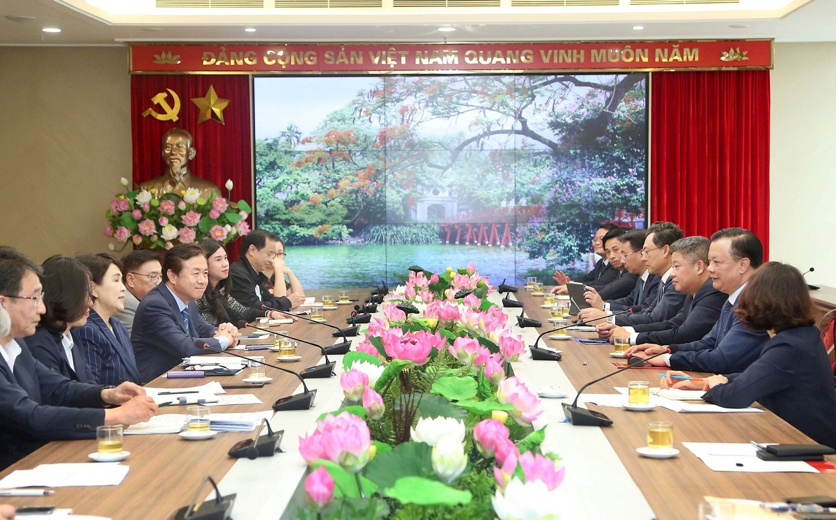 강금실 경기도 기후대사와 경기도 대표단을 접견한 하노이시 당 위원회 딘 띠엔 중 서기(사진: hanoimoi.vn) |