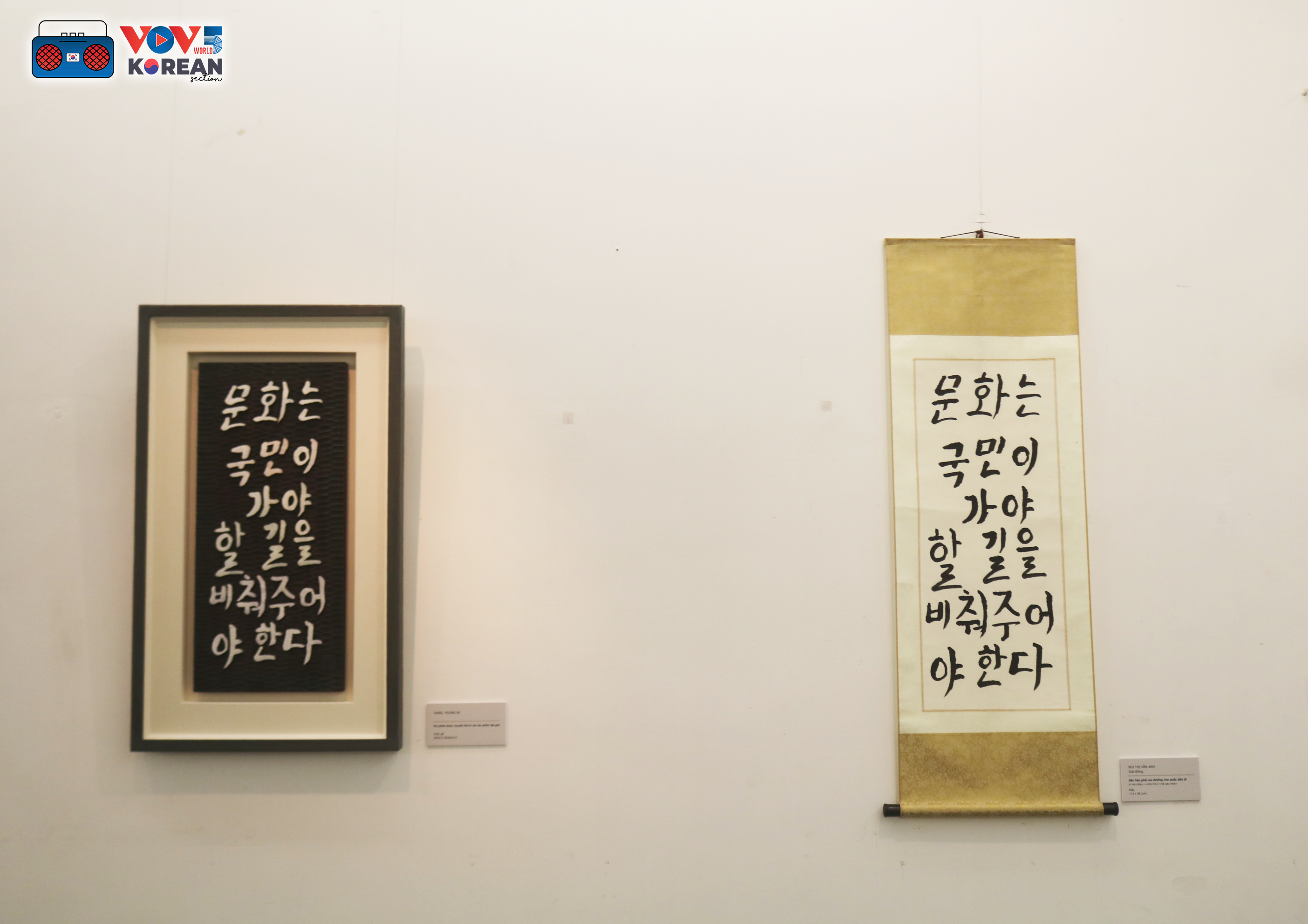 전시회에서 선보이는 캘리그라피 작품들은 족자와 목판에 제작되었으며 베트남과 한국의 사상과 문화적 가치를 기리기 위함이다. 개막식 축사에서 엄승용 한국 문화자원진흥원 이사장은 세종대왕이 한국 국민에 대한 사랑으로 한글을 창조했으며 호찌민 주석도 베트남 민족에 대한 사랑으로 명언들을 남겨두었다고 밝히며 한글과 호찌민 주석 어록의 만남이 양국 간 문화교류 활동에 실질적인 기여를 할 것으로 기대한다고 했다.