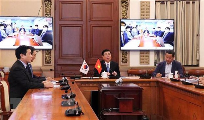 호찌민시 응우옌 타인 퐁 (Nguyễn Thành Phong) 인민위원장은 부산시 변성환 시장 대행과 온라인 회담을 가진 모습 [사진: Xuân Khu/베트남통신사] |