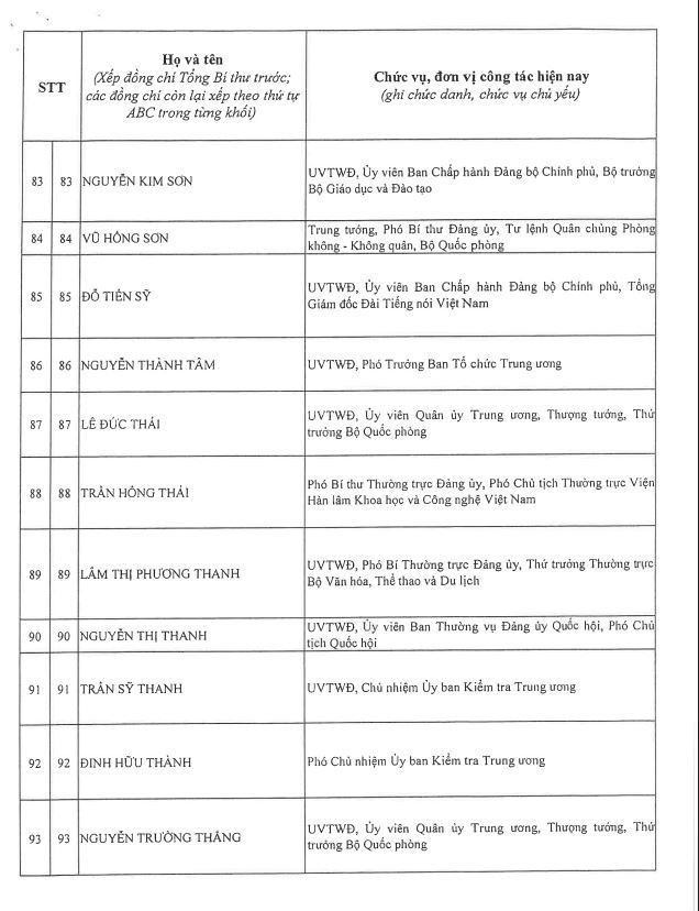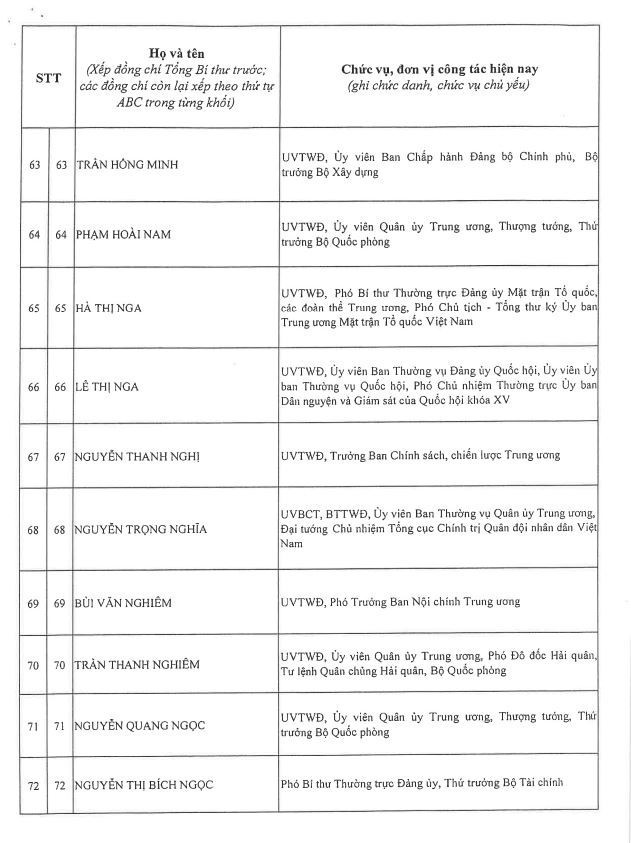 중앙 기관 당선자 명단에는 또 럼(Tô Lâm) 당 서기장을 비롯하여, 쩐 껌 뚜(Trần Cẩm Tú) 당 상임 서기, 쩐 타인 먼(Trần Thanh Mẫn) 국회의장, 레 민 흥(Lê Minh Hưng) 당 중앙 조직부장, 쩐 시 타인(Trần Sỹ Thanh) 당 중앙 검사위원장, 팜 티 타인 짜(Phạm Thị Thanh Trà) 부총리, 판 반 장(Phan Văn Giang) 국방부 장관, 르엉 땀 꽝(Lương Tam Quang) 공안부 장관, 다오 홍 란(Đào Hồng Lan) 보건부 장관, 응우옌 낌 선(Nguyễn Kim Sơn) 교육훈련부 장관, 도 띠엔 시(Đỗ Tiến Sỹ) ‘베트남 소리’ 국영 라디오 방송국(VOV) 총사장 등이 이름을 올렸다.
