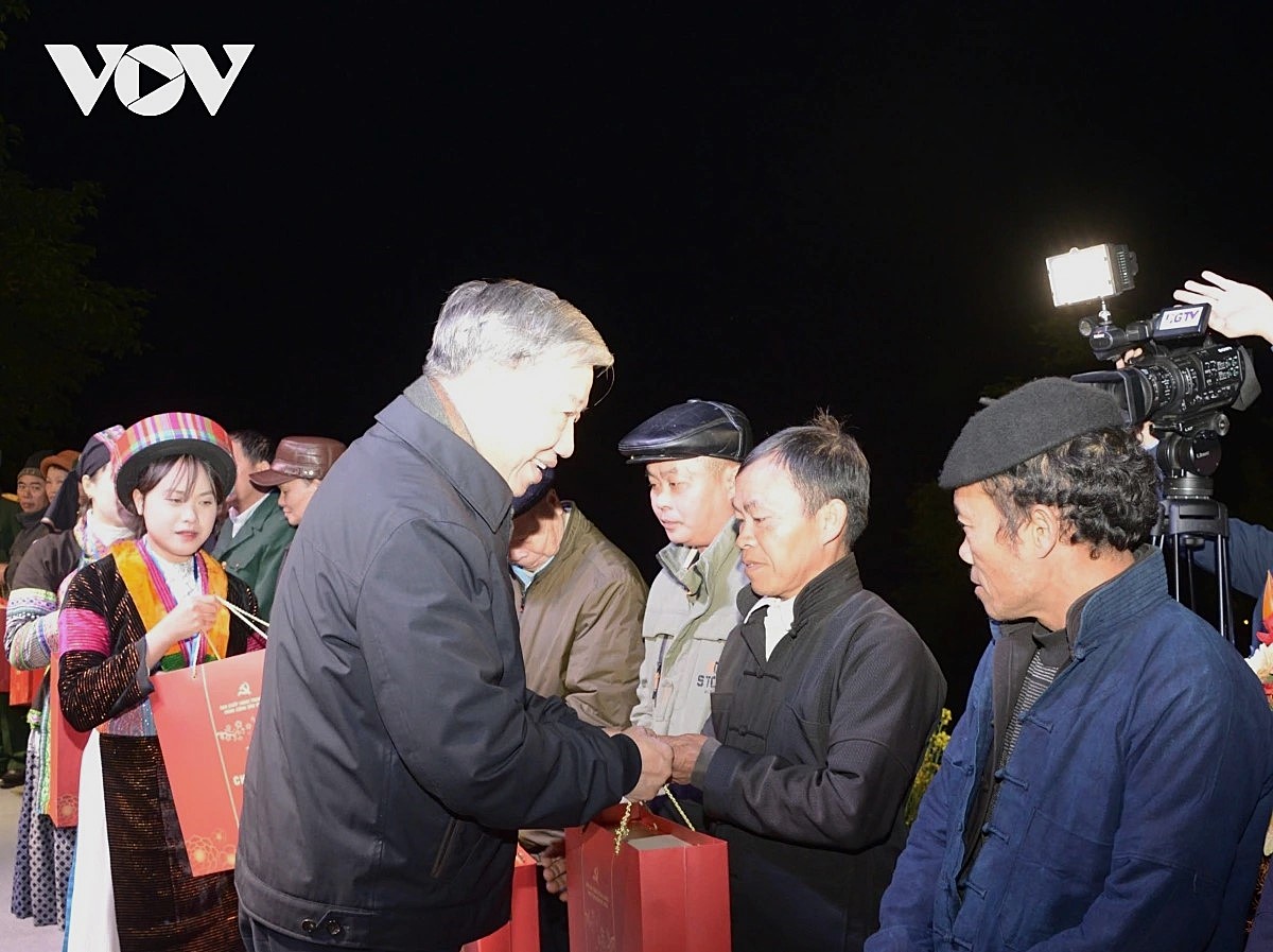 같은 날 저녁 또 럼 당 서기장은 꽌바현 각 소수민족 공동체와 차를 마시고 소통하는 시간을 가졌으며, 정책 대상 가구와 유공자 가정 30곳에 감사의 마음을 담아 선물을 전달했다.