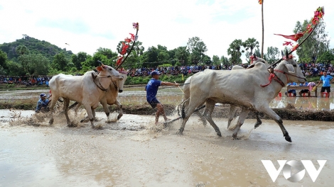 (VOVWORLD) - 안장(An Giang)성 로(Rô) 사원에서 열리는 황소 경주 대회는 남부 크메르족 사람들의 전통 축제 중 하나이다. 이 전통 행사는 지역 사회 공동체를 하나로 묶어 주며, 크메르족 마을 주민들 정신생활의 중요한 문화적 가치와 아름다움을 보여주었다.