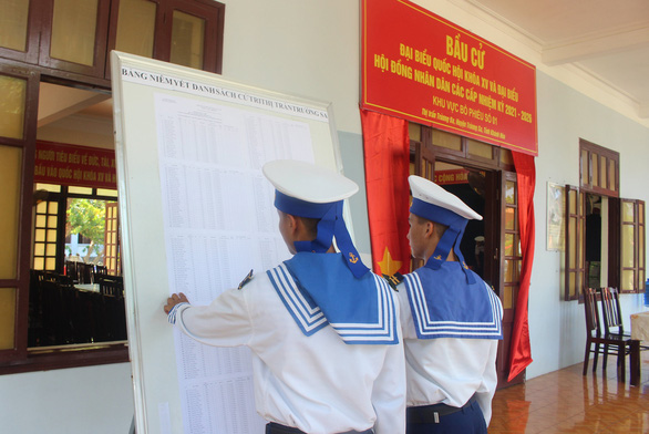 송뜨읍 인민위원회에서 후보자 명단을 보고 있는 송뜨데이 섬 해군전사들의 모습 [사진: 응옥민/ tuoitre.vn]