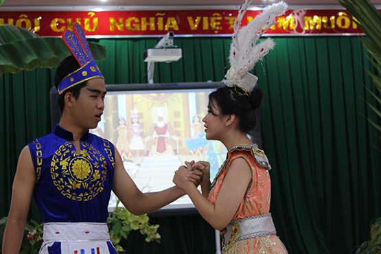 "저희 반은 “담산 (Đam Săn) – 전설의 이야기라는 제목으로 담산 (Đam Săn) 작품을 연출했습니다. 작품은 베트남 소수민족의 에데사람들의 자연 정복 열망을 나타냄으로써 재미있을 뿐만 아니라 사람들에게 정신적인 의미가 있습니다.