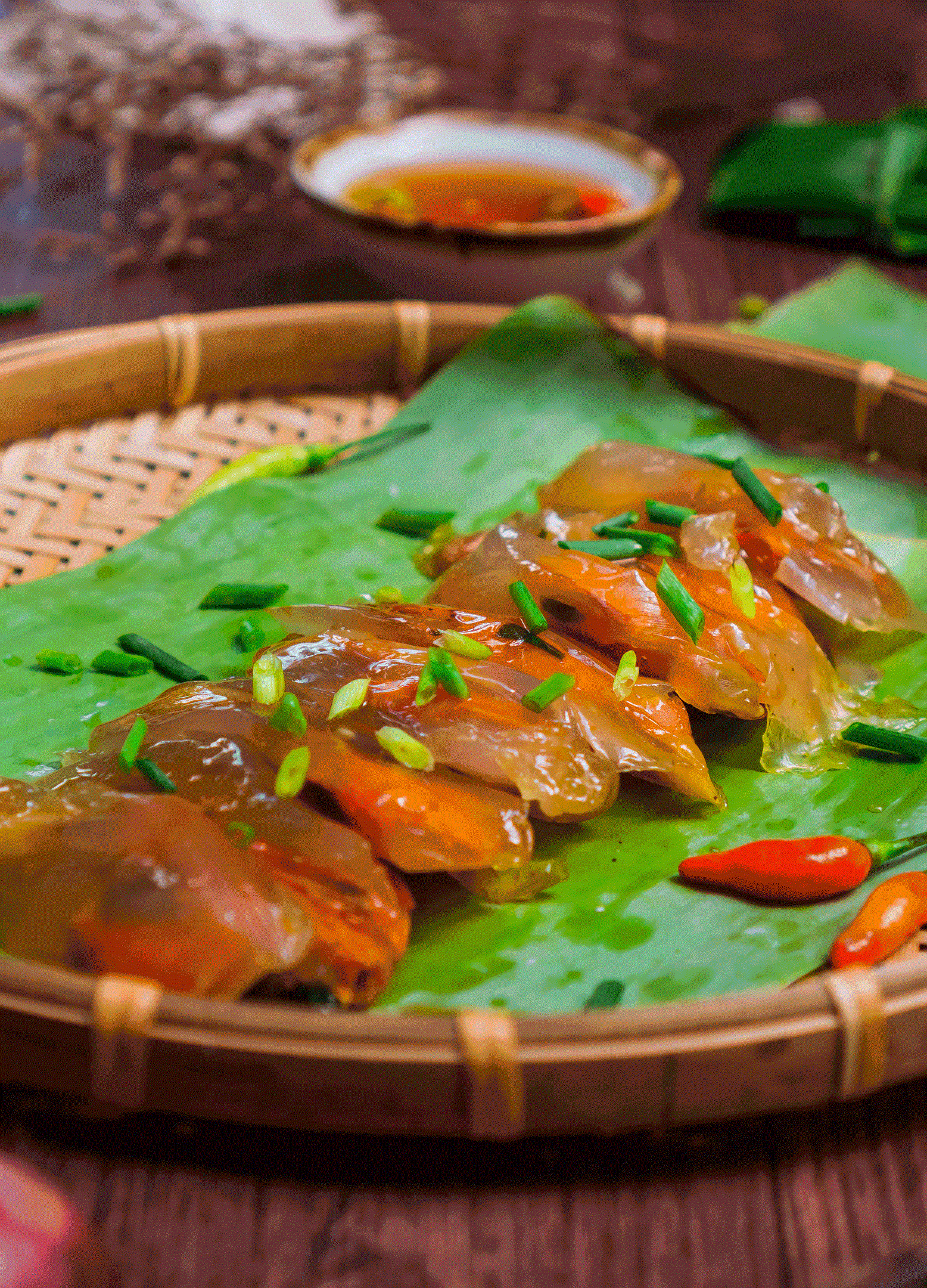 케이크의 그물 모양을 만드는데 매우 정교해야 하는 만큼 많은 시간이 걸립니다. 쫄깃쫄깃한 맛과 양념으로 밀가루를 휘젓는 비법이 조화롭게 어우러진 케이크입니다. 부드럽고 쫄깃한 케이크 조각을 눈길을 끄는 그물 모양에 넣고 나서 신선한 녹색 바나나 잎 위에 깔끔하게 배열하여 약간의 양파를 뿌립니다.