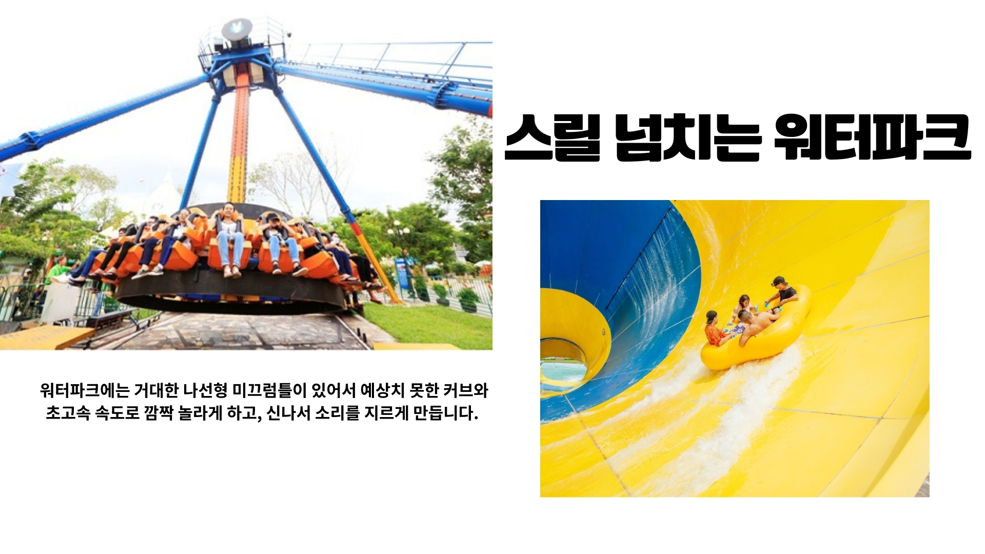 경민: 해변 말고 꼭 가봐야 할 곳이 있는데요, 바로 아주 화려한 워터파크입니다. 지엡 씨, 스릴 있는 놀이 좋아해요?