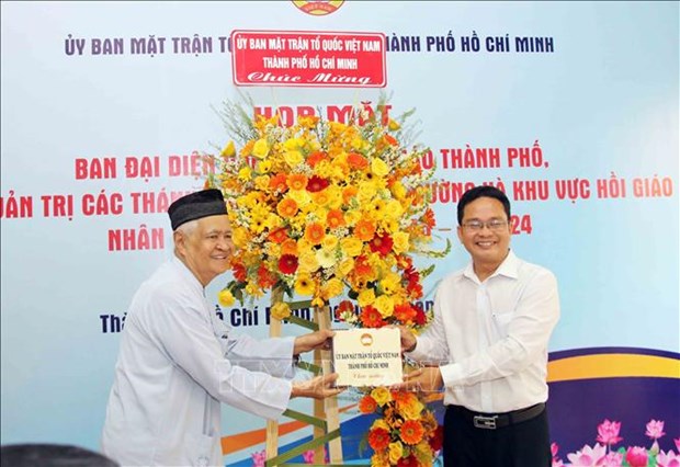 Vice President of HCM City's Vietnam Fatherland Front Committee Pham Minh Tuan presents flowers to a representative of the Muslim community in the city. (Photo: VNA) |