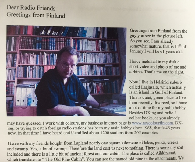 B: There’s a photo of Lauri sitting in front of his huge book collection. Wow, such a treasure. Lauri said he and his friends bought one sq.km of lakes, ponds, creeks, and swamp. The place is called Aihkiniemi, which means “the Old Pine Cabin”. On this lot they put up 11 antennas, each 700 to 1,000 m long.