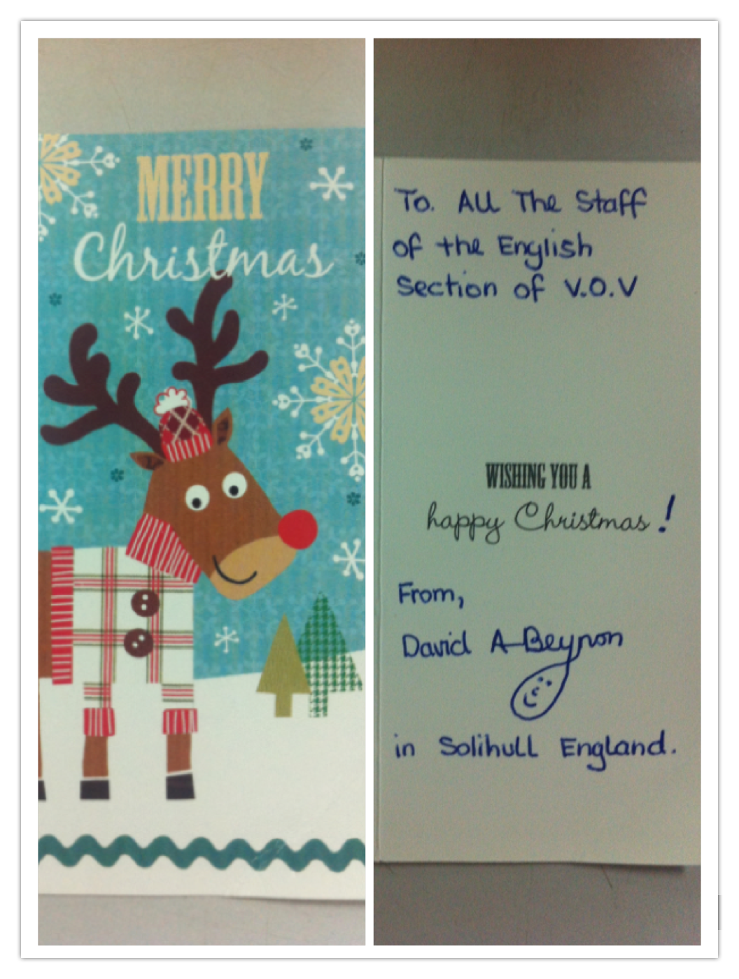 A: David Baynon in Solihull, England, sent us a Christmas card with the image of Rudolf the reindeer and said: “I haven’t been in touch with you for a while but still enjoy your programs. Recently, I listened to VOV on the internet, but still enjoy your shortwave service at 18:00 UTC on 5955 khz with good reception.”