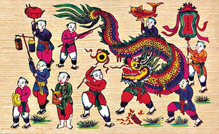 A Dong Ho folk painting depicting children playing with dragon dances and lanterns |