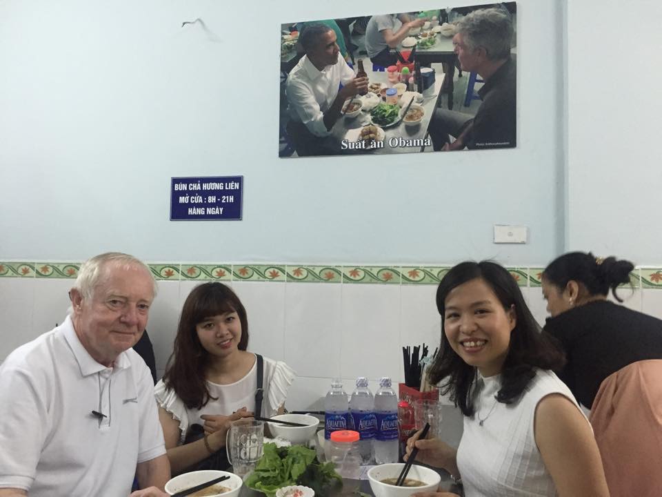 Gerry Neumann from Britain and VOV5's staff Viet Anh and Cam Thi have Bun cha at Huong Lien Bun cha eatery.