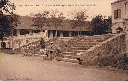 B: The palace later was almost entirely destroyed until only its foundation remained. The foundation is 57 meters long, 41.5 meters wide and 2.3 meters high. Its steps were built with green stone. Four stone dragons are the palace’s only evident remains. The four stone dragons which divided the staircase leading into Kinh Thien palace into three sections were carved in 1467. The dragons are typical of sculptures in the Le dynasty.