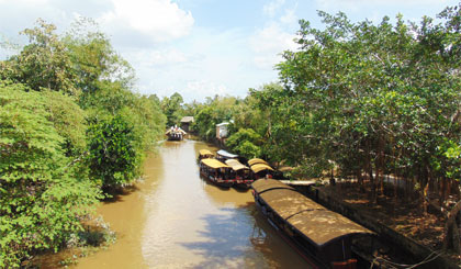 A: Houses in Dong Hoa Hiep are different from the houses built in close proximity to each other in Duong Lam and Phuoc Tich. Dong Hoa Hiep’s houses are scattered in lush orchards and embraced by the winding Cai Be River.