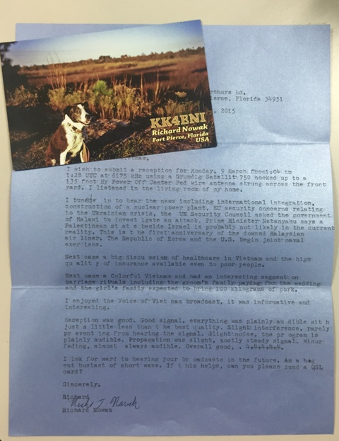 A: Thank you for spreading the word about our contest. We expect many more entries from listeners worldwide in the next 3 months. American listener Richard Nowak sent us a report on our March 9 program at 6175 khz. He used a Grundig Satellite 750 hooked up to a 135-foot Hy Power Off Center Fed wire antenna strung across the front yard of his house in Port Pierce, Florida. He tuned in to hear the news of Vietnam and major world events including the Ukraine crisis, the general election in Pakistan, the joint naval exercises of the Republic of Korea and the US, and the first anniversary of the lost Malaysian flight MH370.
