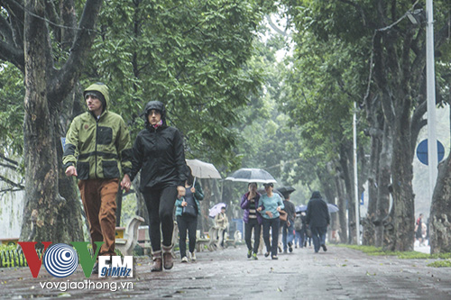 | People take a walk around Hoan Kiem lake in a rainy day |