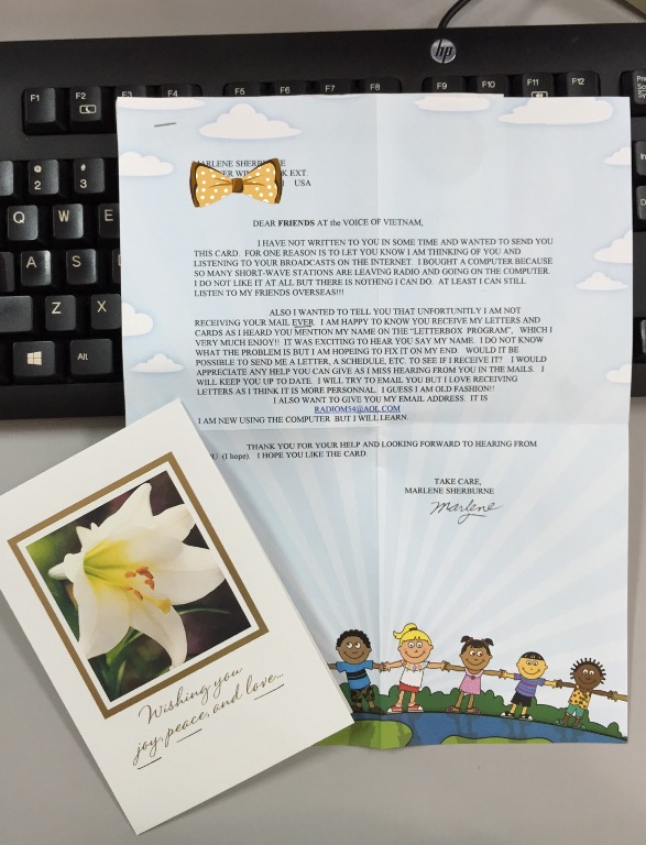 (VOVworld) - We’ve received a lovely postcard and letter from Marlene Sherburne of the US. She wrote: “I haven’t written to you in some time and wanted to send you this card. One reason is to let you know I’m thinking of you and listening to your broadcast on the internet. I bought a computer because so many short-wave stations are leaving radio and going on the computer. I don’t like it at all but there is nothing I can do. At least I can still listen to my friends overseas.”