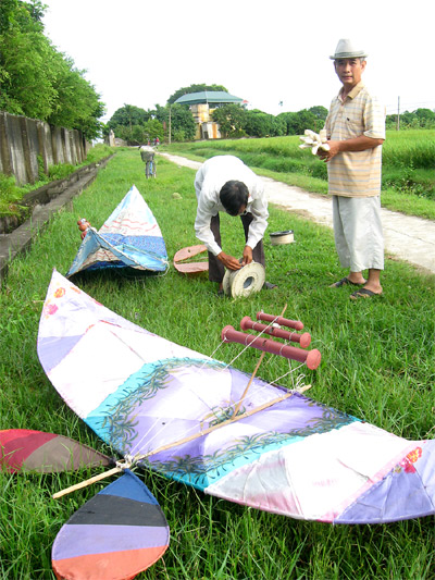 A: “Diều sáo” made in the traditional Vietnamese style have eight ovoid wings with five bamboo flutes in graduated sizes mounted on top. These make a pleasant drone when the kite is flying. The faster the kite swoops, the more exciting is the sound of the flutes.