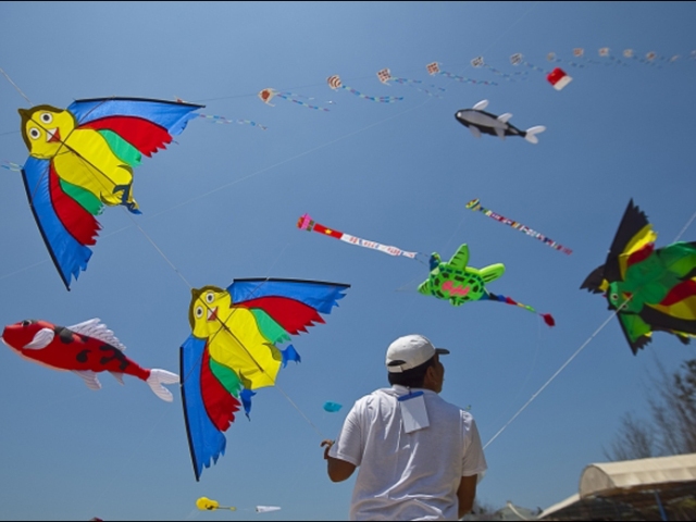 B: Children's kites are usually small, simple and covered with paper, while kites for adults are more complex, often cloth-covered, and feature one or more flutes that whistle as the kites fly.