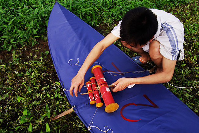 A: A typical adult kite has four parts: the body, the steering string, the flying string and the flutes. The frame is made of smooth bamboo stalks and is well polished. Kite-makers shape bamboo strips into a crescent two to three metres long and one metre wide. After that, they cover the frame with pieces of cotton cloth or carefully glued paper. If one half of the kite is heavier than the other, the steering string will help balance it. This string also serves to direct flight and protect the kite wings from breaking if the wind is too strong. The flying string is also made of bamboo and can be as long as 100m or 150m.