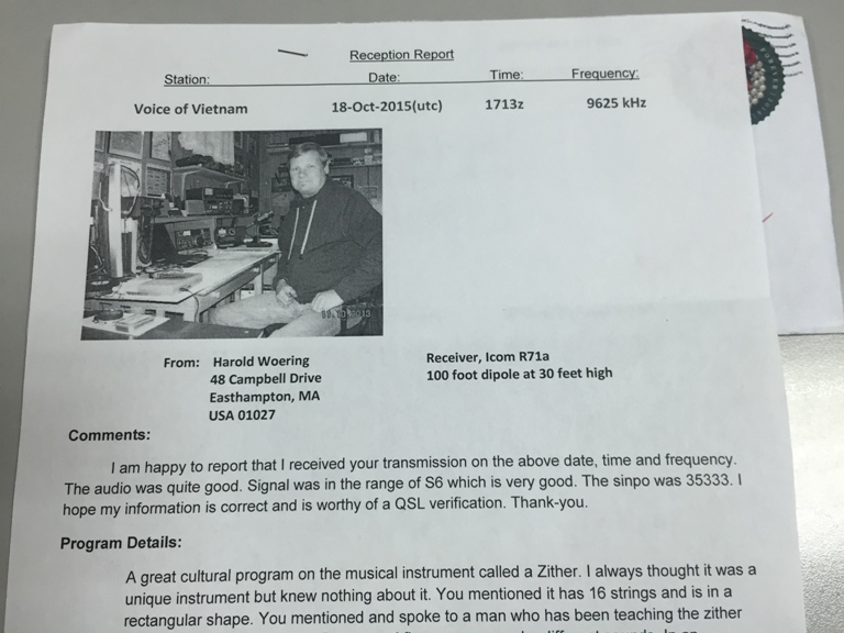 B: Harold said VOV broadcast a great cultural program on the musical instrument called the Zither. “I always thought it was a unique instrument but knew nothing about it. You mentioned it has 16 strings and has a rectangular shape. A man who has been teaching the zither for over 30 years talked about using the fingers to make different sounds. Then a woman, who has only played for a year, talked about her experience. It’s a very informative and educational program. I learned a lot and appreciated the program as well as the music played. I’m glad to see you are still on shortwave and telling the world about your art and culture.”