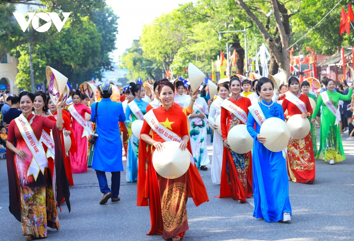 A parade of women wearing Ao dai at the Hanoi Autumn Festival (photo: VOV)