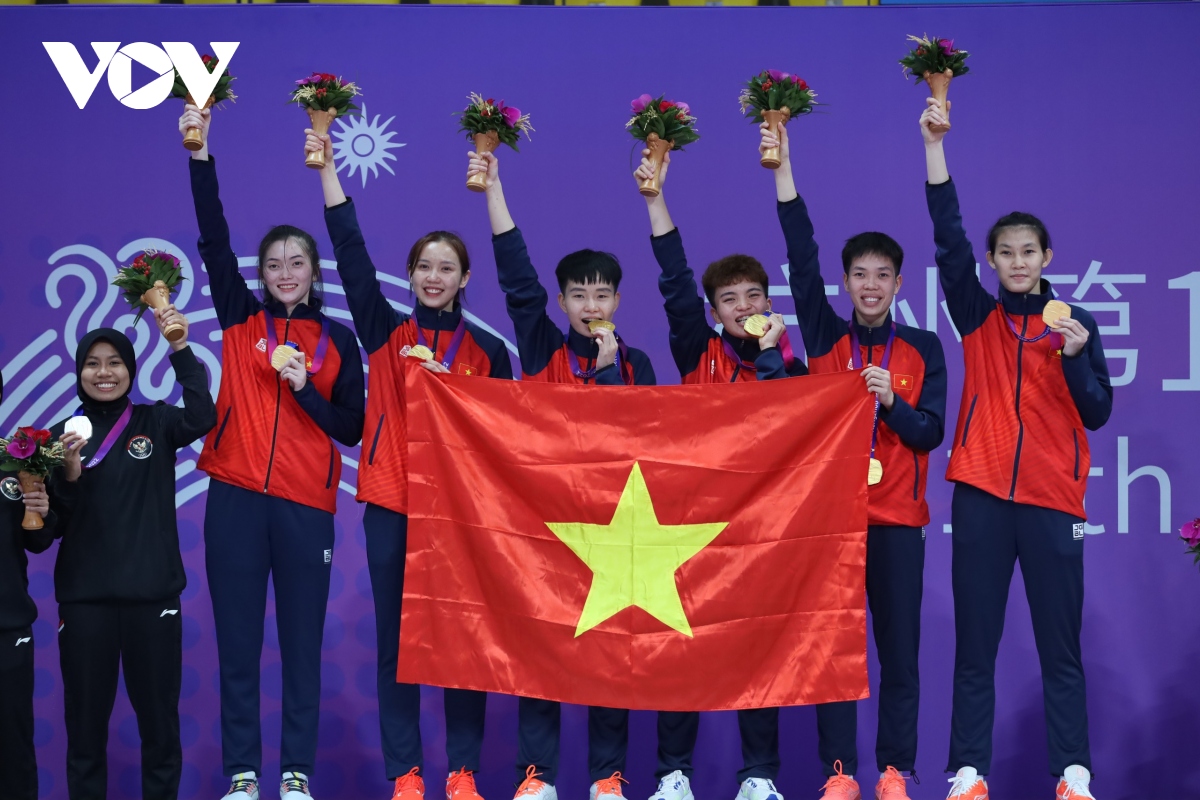 Vietnamese women's sepak takraw squad win a gold medal at the 19th Asian Games in Hangzhou city, China's Zhejiang province. (photo: Hoang Linh/VNA)