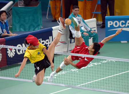 A: Sepak takraw is played on a court similar to a badminton doubles court. The net, similar to a volleyball net, is made of thin nylon cord with a 6 to 8 cm mesh. The most interesting thing about the game might be its ball, which is woven of synthetic fiber.