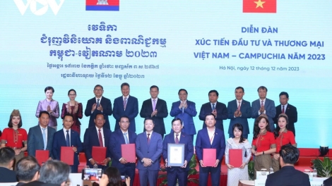 (VOVWORLD) - ຕອນເຊົ້າວັນທີ 12 ທັນວາ, ທ່ານນາຍົກລັດຖະມົນຕີ ຫວຽດນາມ ຟ້າມມິງຈິງ ແລະ ທ່ານນາຍົກລັດຖະມົນຕີ ກຳປູເຈຍ Hun Manet ໄດ້ເຂົ້າຮ່ວມເວທີປາໄສສົ່ງເສີມການລົງທຶນ ແລະ ການຄ້າ ຫວຽດນາມ - ກຳປູເຈຍ.