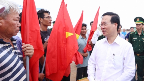 (VOVWORLD) -ໃນການລົງເຮັດວຽກຢູ່ແຂວງ ບິ່ງທ້ວນ, ຕອນເຊົ້າວັນທີ 17 ມິຖຸນາ, ຢູ່ເມືອງເກາະຝູກຸຍ, ທ່ານປະທານປະເທດ ວໍ້ວັນເຖືອງ ແລະ ທ່ານຮອງນາຍົກລັດຖະມົນຕີ ເຈີ່ນຮົ່ງຮ່າ ໄດ້ມອບຂອງຂວັນ ແລະທຸງຊາດ 1000 ຜືນໃຫ້ຊາວປະມົງເພື່ອລະດົມກຳລັງໃຈແກ່ຊາວປະມົງໃຫ້ມີຄວາມໝັ້ນໃຈເດີນທະເລຫາປາ