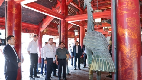 (VOVWORLD) - ຕອນບ່າຍວັນທີ 4 ພຶດສະພາ, ຢູ່ຮ່າໂນ້ຍ, ທ່ານນາຍົກລັດຖະມົນຕີ ຫວຽດນາມ ຟ້າມມິງຈິງ ແລະ ທ່ານນາຍົກລັດຖະມົນຕີ ລູກຊຳບວກ ພ້ອມກັນໄປຢ້ຽມຢາມວັນມຽວ - ກວັກຕືຢາມ, ຫໍພິພິທະພັນວິຈິດສິນ ຫວຽດນາມ.