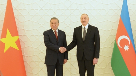 (VOVWORLD) - ໂດຍຕອບຮັບຄຳເຊີນຂອງທ່ານ Ilham Aliyev ປະທານາທິບໍດີ ອາເຊັກໄບຊານ, ທ່ານ ໂຕເລິມ ເລຂາທິການໃຫຍ່ ຄະນະບໍລິຫານງານສູນກາງພັກຄອມມຸນິດ ຫວຽດນາມ ພ້ອມດ້ວຍພັນລະຍາ ໄດ້ໄປຢ້ຽມຢາມທາງລັດຖະກິດຢູ່ ອາເຊັກໄບຊານ ແຕ່ວັນທີ 7 ພຶດສະພາ ຫາວັນທີ 8 ພຶດສະພາ. ຕອນບ່າຍວັນທີ 7 ພຶດສະພາ, ພາຍຫຼັງພິທີຕ້ອນຮັບຢູ່ທຳນຽບປະທານາທິບໍດີ, ທ່ານ Ilham Aliyev ປະທານາທິບໍດີ ອາເຊັກໄບຊານ ແລະ ທ່ານ ໂຕເລິມ ເລຂາທິການໃຫຍ່ ຫວຽດນາມ ໄດ້ດຳເນີນການພົບປະເຈລະຈາ.