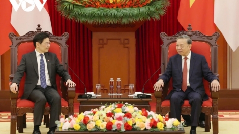 (VOVWORLD) - ຕອນເຊົ້າວັນທີ 26 ມີນາ, ຢູ່ສຳນັກງານສູນກາງພັກ, ຮ່າໂນ້ຍ, ທ່ານເລຂາທິການໃຫຍ່ ໂຕເລິມໄດ້ໃຫ້ການຕ້ອນຮັບທ່ານນາຍົກລັດຖະມົນຕີ ສິງກະໂປ Lawrence Wong ທີ່ພວມມີການຢ້ຽມຢາມຫວຽດນາມ.
