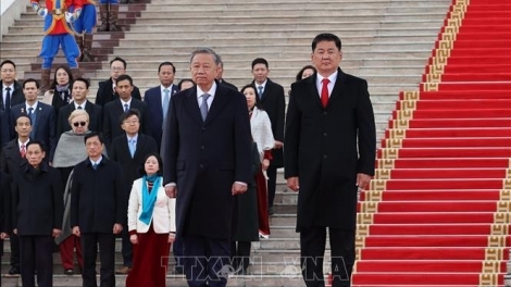 (VOVWORLD) - ພິທີຕ້ອນຮັບທ່ານເລຂາທິການໃຫຍ່, ປະທານປະເທດ ຫວຽດນາມ ໂຕເລິມ ໃນໂອກາດມາຢ້ຽມຢາມທາງລັດຖະກິດຢູ່ ມົງໂກນ ໃນລະຫວ່າງວັນທີ 30 ກັນຍາ - 1 ຕຸລາ ໄດ້ຈັດຂຶ້ນຢ່າງສົມກຽວຕາມພິທີການສູງສຸດ ທີ່ສະຫງວນໃຫ້ແກ່ປະມຸກລັດ.