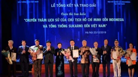 ພິທີມອບລາງວັນ ການເສັງຊອກຮູ້ກ່ຽວກັບການຢ້ຽມຢາມ ອິນໂດເນເຊຍ ຄັ້ງປະຫວັດສາດຂອງທ່ານປະທານໂຮ່ຈີມິນ ແລະ ການຢ້ຽມຢາມຫວຽດນາມຂອງທ່ານປະທານາທິບໍດີ Sukarno