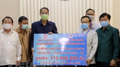 (VOVWORLD) - ຕອນເຊົ້າວັນທີ 10 ເມສາ, ຢູ່ຫ້ອງວ່າການນາຍົກລັດຖະມົນຕີ ລາວ ຢູ່ນະຄອນຫຼວງ ວຽງຈັນ, ຜູ້ຕາງໜ້າຂອງ ສະມາຄົມໃຫຍ່ຊາວຫວຽດນາມ ອາໄສຢູ່ລາວ ແລະ ສະມາຄົມວິສາຫະກິດ ຫວຽດນາມ ຮ່ວມມື ແລະ ລົງທຶນຢູ່ລາວ ໄດ້ມອບເງິນຈຳນວນ 113.900.000 ກີບ (ປະມານ 13.000 USD)ໃຫ້ແກ່ທ່ານສົມດີ ດວງດີ ຮອງນາຍົກລັດຖະມົນຕີ, ລັດຖະມົນຕີກະຊວງການເງິນລາວ ເພື່ອຮ່ວມແຮງຮ່ວມໃຈພ້ອມກັບລັດຖະບານ ແລະ ປະຊາຊົນລາວໃນບັ້ນຕໍ່ສູ້ກັບໂລກລະບາດ Covid -19.