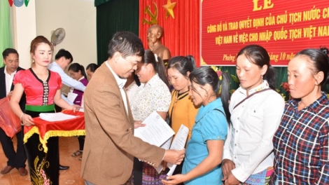 (VOVWORLD) -ວັນທີ 10 ຕຸລາ, ເມືອງ ອຽນເຈົາ, ແຂວງ ເຊີນລາ ໄດ້ຈັດຕັ້ງພິທີປະກາດ ແລະ ມອບຂໍ້ຕົກລົງ ຂອງ ປະທານປະເທດ ວ່າດ້ວຍການຖືສັນຊາດ ຫວຽດນາມໃຫ້ພົນລະເມືອງລາວ 123 ຄົນ ທີ່ເຄື່ອນຍ້າຍພູມລຳເນົາແບບ ຊະຊາຍ ແລະ ແຕ່ງງານບໍ່ມີທະບຽນໃນບໍລິເວັນເມືອງ.