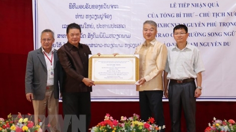 (VOVWORLD) - ວັນທີ 29 ມີນາ, ຢູ່ນະຄອນຫຼວງວຽງຈັນ, ລາວ ໄດ້ດຳເນີນພິທີມອບ-ຮັບຂອງຂວັນຈາກທ່ານເລຂາທິການໃຫຍ່, ປະທານປະເທດຫວຽດນາມ ຫງວຽນຝູຈ້ອງ ໃຫ້ແກ່ໂຮງຮຽນສອງພາສາລາວ-ຫວຽດ ຫງວຽນຢູ.