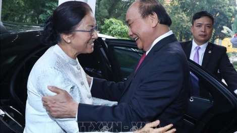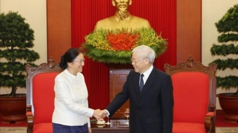 ທ່ານເລຂາທິການໃຫຍ່, ປະທານປະເທດ ຫງວຽນຝູຈ້ອງ ຕ້ອນຮັບທ່ານນາງປະທານສະພາແຫ່ງຊາດລາວ ປານີ ຢາທໍ່ຕູ້