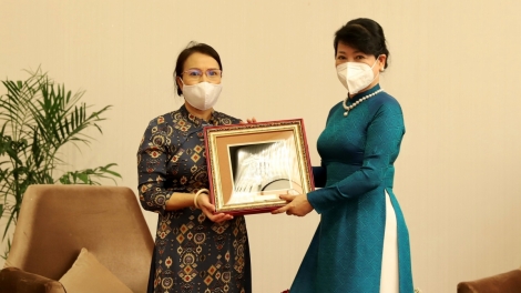 ພັນລະຍາປະທານປະເທດ ຫວຽດນາມ ໃຫ້ການຕ້ອນຮັບຜູ້ຕາງໜ້າ ໂຮງຮຽນສອງພາສາ ລາວ - ຫວຽດນາມ ຫງວຽນຢູ