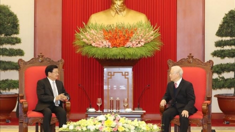 ທ່ານເລຂາທິການໃຫຍ່, ປະທານປະເທດຫວຽດນາມ ຫງວຽນຟູຈ້ອງ ຕ້ອນຮັບທ່ານ ນາຍົກລັດຖະມົນຕີ ທອງລຸນ ສີສຸລິດ