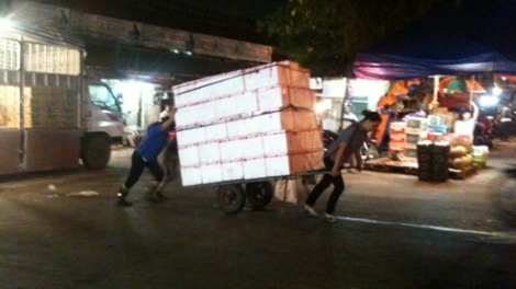 (Vovworld)-ເວລາ 23 ໂມງ, ຢູ່ຕໍ່ໜ້າປະຕູໂຂງຕະຫຼາດຂາຍສົ່ງລອງບຽນ ( ຮ່າໂນ້ຍ) ສຽງແກລົດເລີ່ມດັ່ງເນື່ອງນັນ, ລົດບັນທຸກໝາກໄມ້ຄັນໜຶ່ງພວມເປີດໄຟຊີຍານອ້ຽວຂວາ