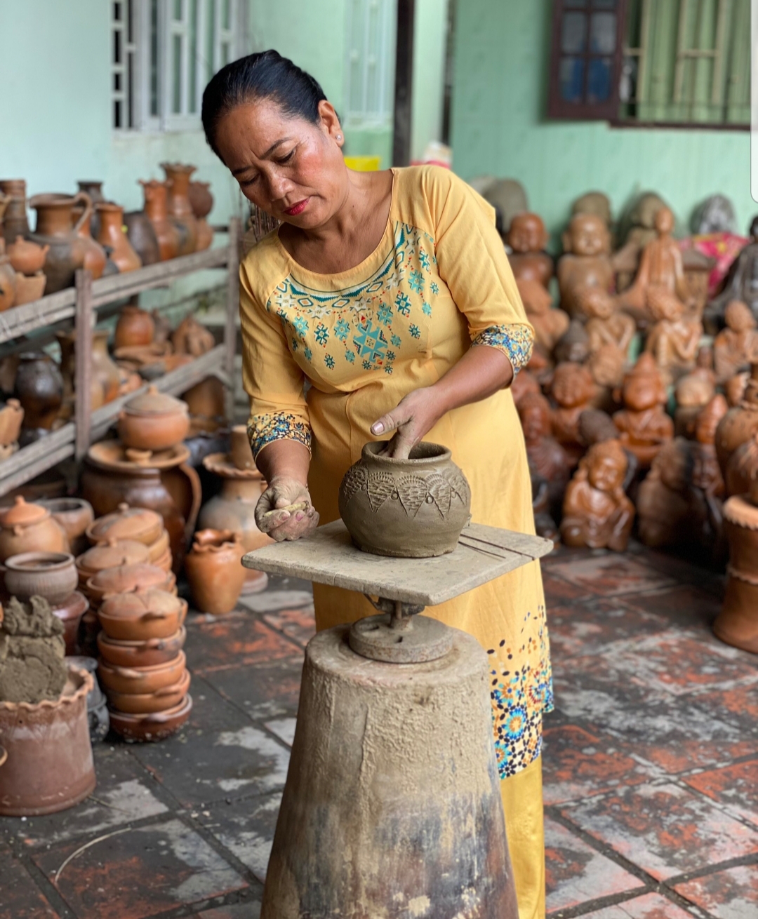 ປະສົມດິນກ່ອນ ແລ້ວຈຶ່ງມາເຮັດຜະລິດຕະພັນໃຫ້ເປັນຮູບເປັນຮ່າງ ຫຼັງຈາກນັ້ນ ຈຶ່ງເຮັດລວດລາຍໃສ່, ເມື່ອສຳເລັດແລ້ວ ເອົາໄປຕາກແຫ້ງ ສຸດທ້າຍຈຶ່ງເອົາໄປເຜົາ. ຄອບຄົວຂ້າພະເຈົ້າທຸກຄົນ ແມ່ນເຮັດອາຊີບນີ້ໝົດ, ຂ້າພະເຈົ້າແມ່ນລຸ້ນທີ່ 4 ແລ້ວ ແລະ ກໍ່ເຮັດຜະລິດຕະພັນຫຼາຍຢ່າງຄື: ເຄື່ອງສິລະປະຫັດຖະກຳ, ໂຖດອກໄມ້ທີ່ນັບມື້ນັບສວຍງາມ.