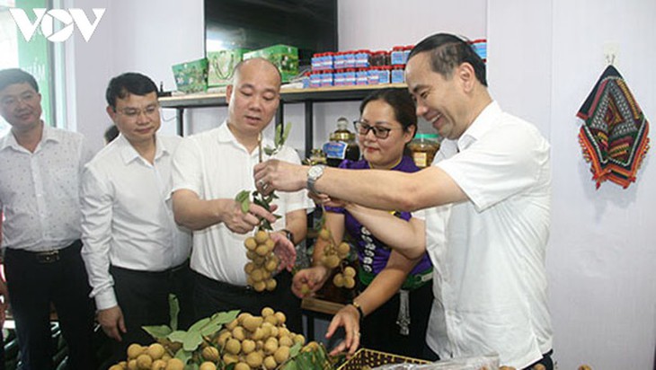 ທ່ານ ຫງວຽນກວັກແຄງ, ຮອງປະທານ ຄະນະກຳມະການປະຊາຊົນ ແຂວງ ເຊີນລາ ແນະນຳຜະລິດຕະພັນຢູ່ງານວາງສະແດງສິນຄ້າຢູ່ຮ່າໂນ້ຍ |