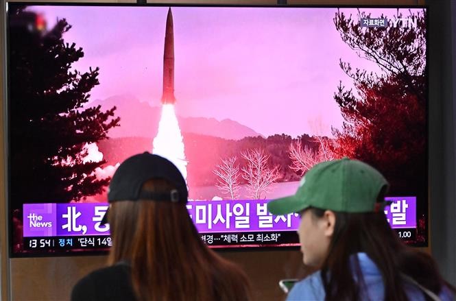 ປະຊາຊົນຕິດຕາມຂ່າວກ່ຽວກັບການຍິງລູກສອນໄຟຂອງ ສປປ.ເກົາຫຼີ ຜ່ານໂທລະພາບ (ພາບ: AFP/TTXVN) |