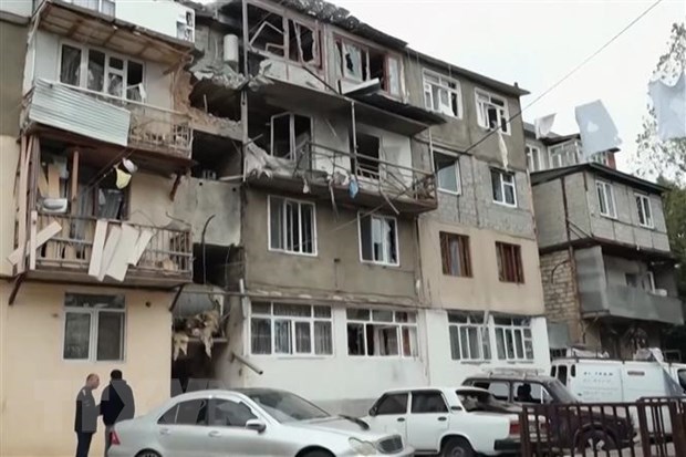 ບັນດາຕຶກອາຄານຖືກເປເພໃນບັ້ນການທະຫານ ໂດຍ ອາເຊັກໄບຢານ ດຳເນີນ ຢູ່ເທດສະບານເມືອງ Stepanakert ຂຶ້ນກັບເຂດຂັດແຍ້ງ Nagorny-Karabakh ໃນວັນທີ 20 ກັນຍາ 2023 (ພາບ: AFP/TTXVN) |