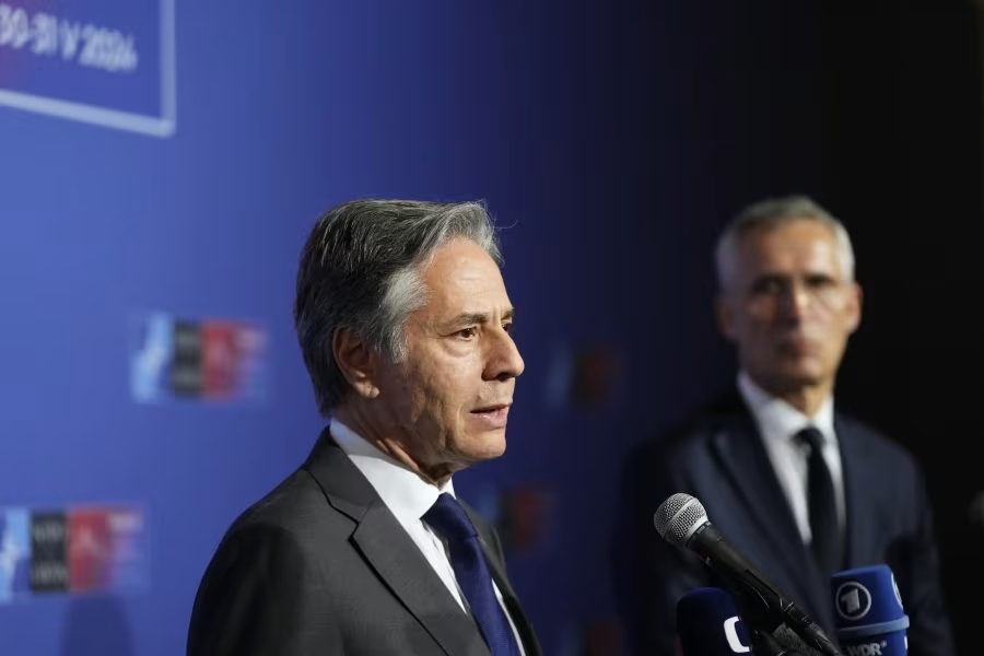 ລັດຖະມົນຕີການຕ່າງປະເທດ ອາເມລິກາ Antony Blinken ແລະ ທ່ານ Jens Stoltenberg ເລຂານຸການ ນາໂຕ. ພາບ. AP/Petr David Josek: |