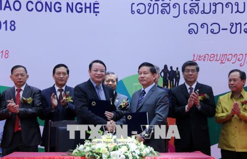 ພິທີລົງນາມໃນສັນຍາວ່າດ້ວຍການຮ່ວມມື ແລະຖ່າຍທອດເຕັກໂນໂລຢີ ລະຫວ່າງບັນດາມະຫາວິທະຍາໄລ, ວິສາຫະກິດ ຫວຽດນາມ ກັບບັນດາວິສາຫະກິດລາວ (ພາບ: Pham Kien/TTXVN) |
